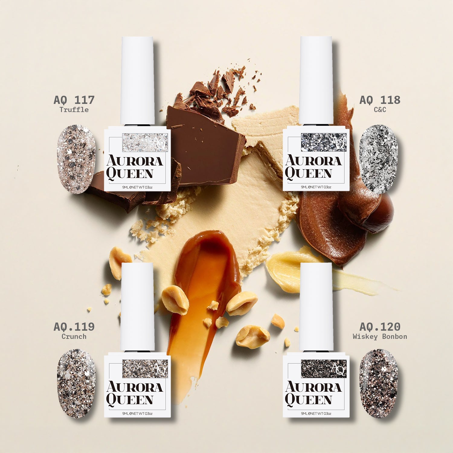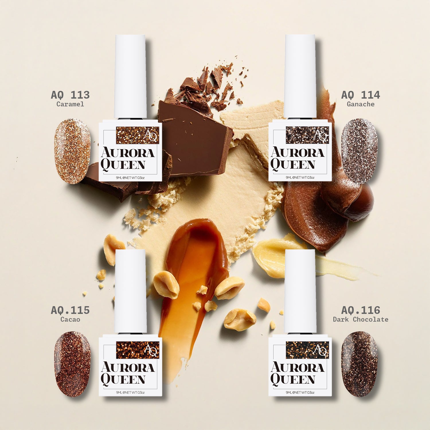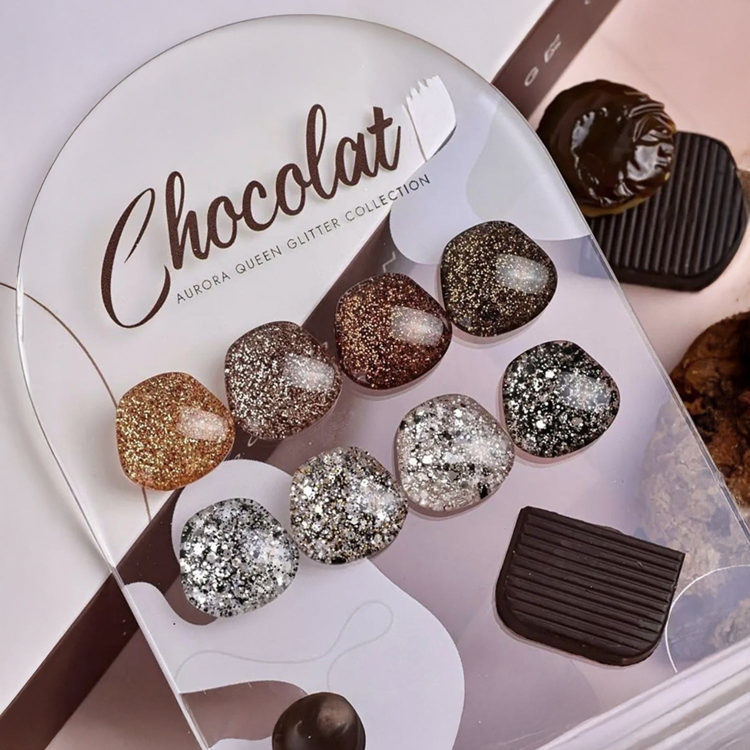 Aurora Queen CHOCOLAT serisi, kahverenginin sıcak tonlarını modern bir dokunuşla buluşturan pırıltılı jel oje koleksiyonudur.